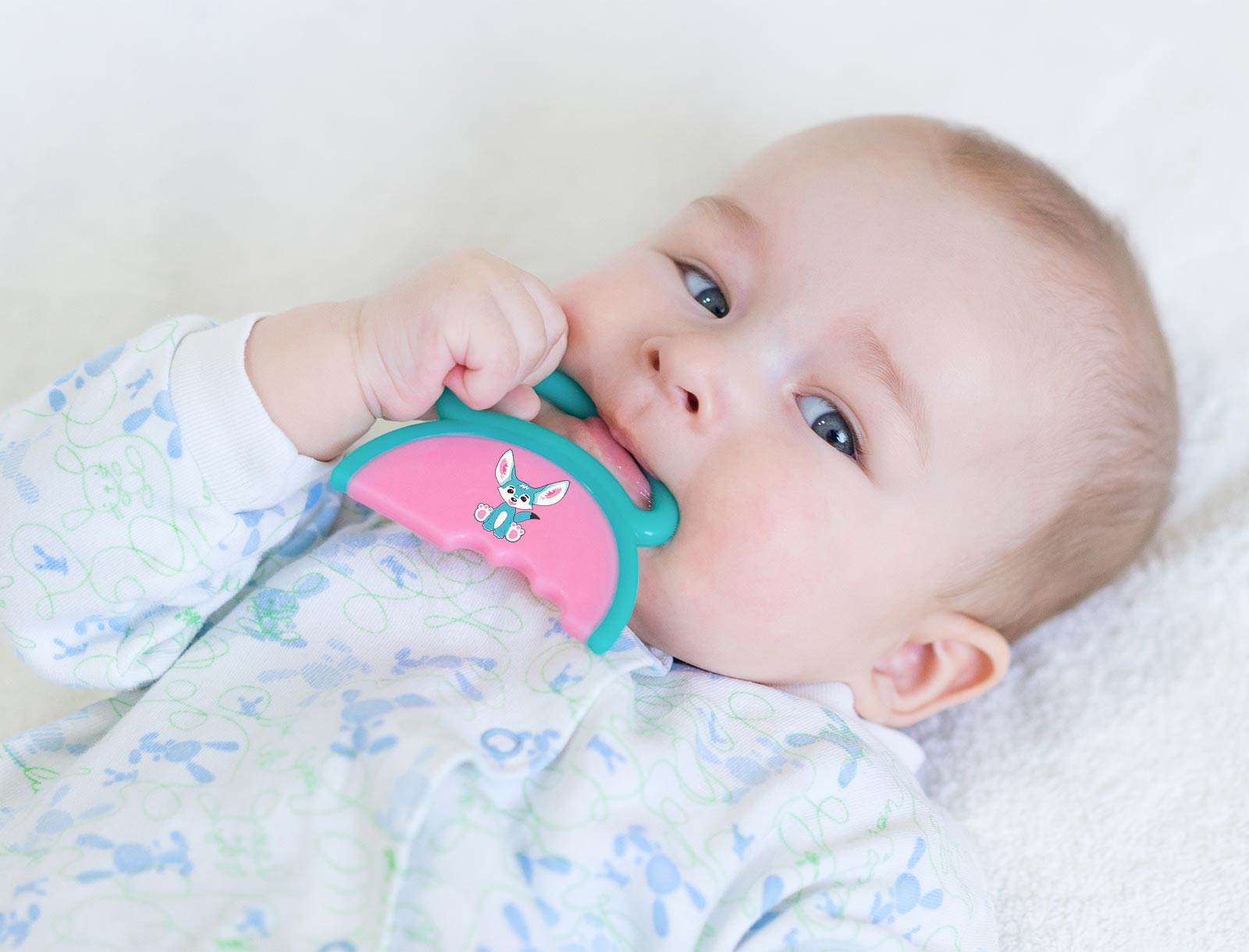 - Podaj dziecku coś do gryzienia. Najlepsze będą do tego gryzaczki. Zabawka powinna być większa niż usta malucha, aby nie doszło do zadławienia.